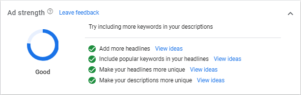 When you’re crafting your headline and description variations, make sure to keep an eye on your ad strength and try to achieve a score of Good or Excellent. According to Google, improving your ad strength from Poor to Excellent can increase clicks and conversions by an average of 9%.